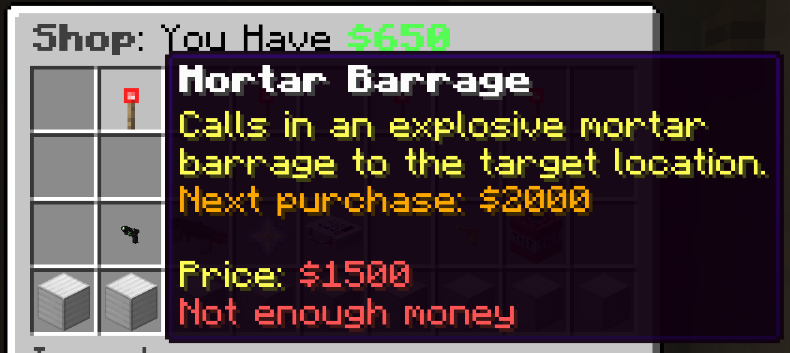- Mortar Barrage: old – $2000, new – $1500, increases by $500 each purchase up to $3500