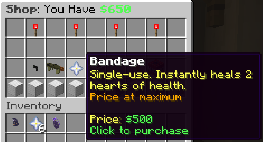 - Bandage: old – $500, new – $200, increases by $50 each purchase up to $500