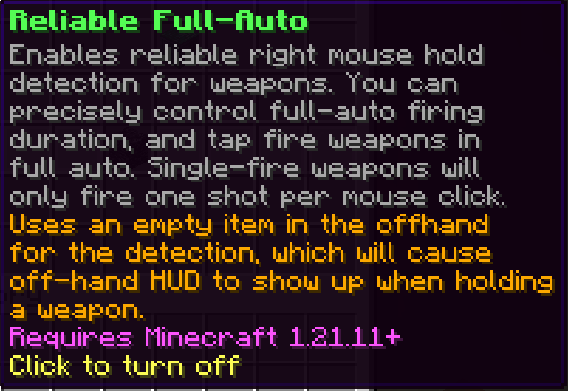 This ability requires Minecraft 1.21.11+ clients. Our underlying server version remains the same for now, and older clients can play as before and will retain the previous behavior. It is nonetheless recommended to upgrade to the latest version of Minecraft to take advantage of this feature, and because we will be updating our GunColony server Minecraft version soon (thanks to our completed MythicMobs replacement – see below). If you want to revert to the old full-auto behavior, you can toggle the feature off in /settings. Note that to enable the feature, we use an off-hand item with an empty model that simulates the behavior of Spears; this will cause an empty off-hand hotbar HUD to appear on the bottom left of the screen when holding a gun.